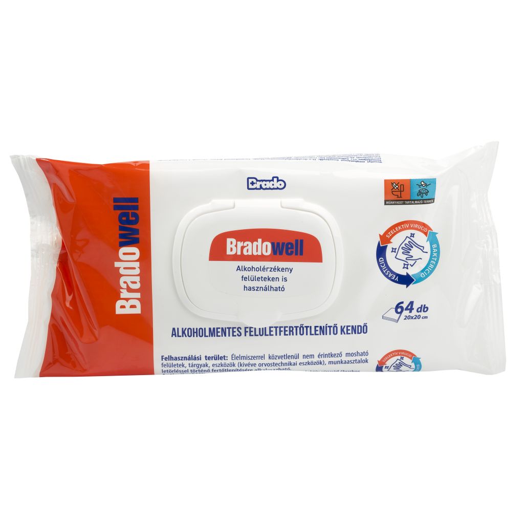 Bradowell Alkoholmentes felületfertőtlenítő kendő 64db kupakos